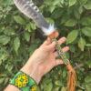 The handle features handwoven Shipibo glass beadwork created in traditional geometric patterns. Shipibo artisans use these designs to express energetic pathways, balance and protection. The patterns connect to the same visual language found in Shipibo healing work and ceremonial songs. Each handle is beaded by hand, and no two pieces are exactly alike. Small variations in color and pattern are part of the work and reflect the living nature of the craft.
